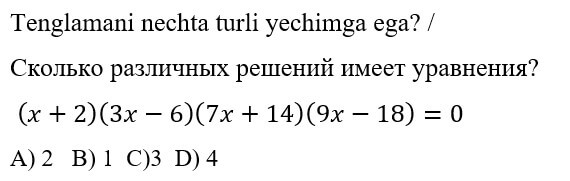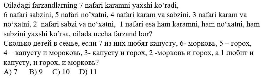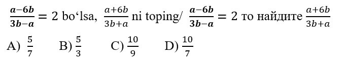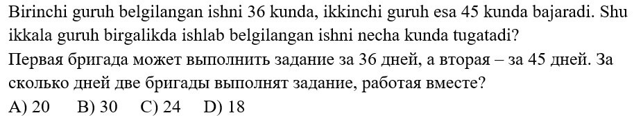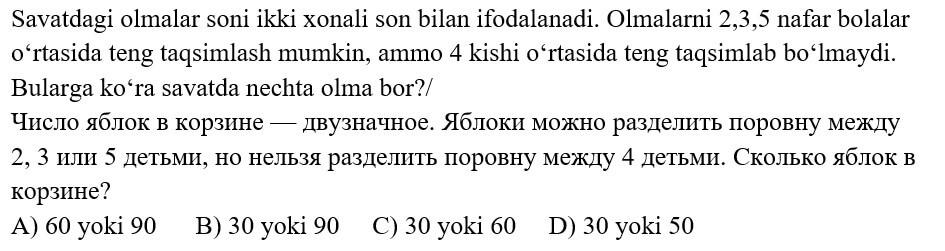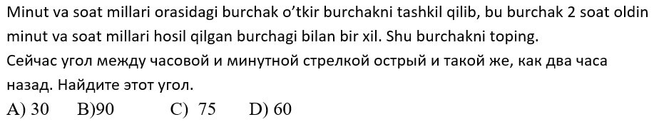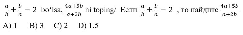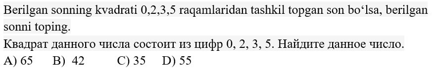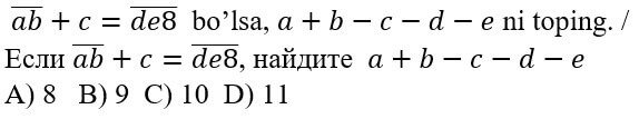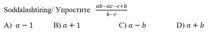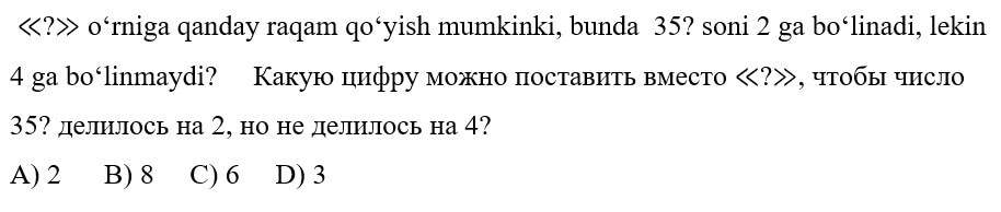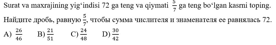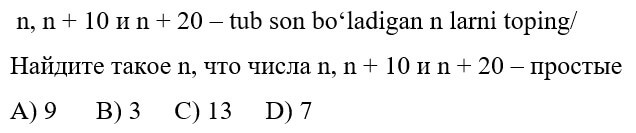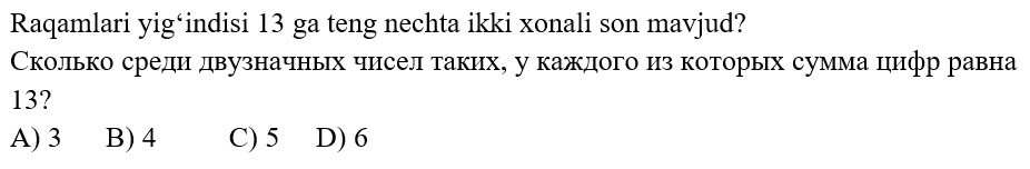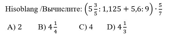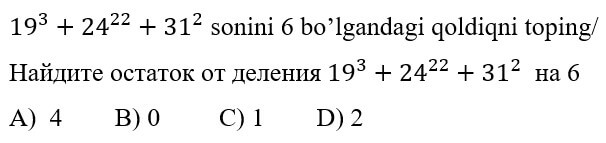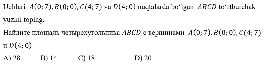 1234567891011121314151617181920 7-SINF MATEMATIKA FANIDAN ONLINE OLIMPIADA 7-sinf o'quvchilari uchun matematika fanidan online olimpiada savollari Manba: oo.uzedu.uz Test savollar soni: 20 ta Bajarish uchun ajratilgan vaqt: 60 daqiqa Barcha ma'lumotlarni to'g'ri kiriting. 1. . A B C D 4 2. . A B C D 2 3. . A B C D 2 4. . A B C D 4 5. . A B C D 2 6. . A B C D 1 7. . A B C D 3 8. . A B C D 2 9. . A B C D 1 10. . A B C D 1 11. . A B C D 1 12. . A B C D 1 13. . A B C D 3 14. . A B C D 4 15. . A B C D 4 16. . A B C D 4 17. . A B C D 4 18. . A B C D 3 19. . A B C D 1 20. . A B C D 2 Facebook Twitter VKontakte 0% Перезапустить тест