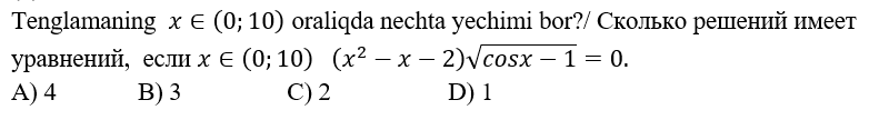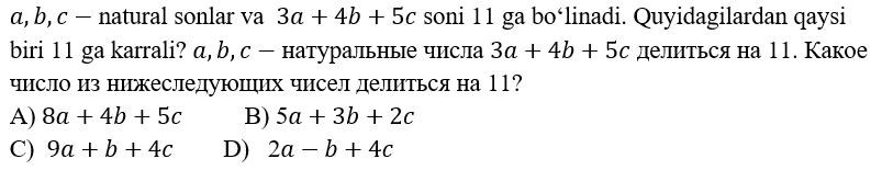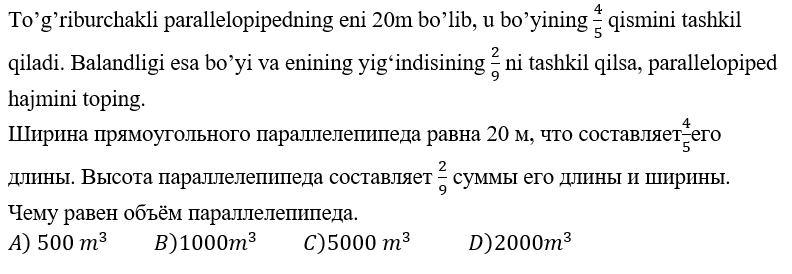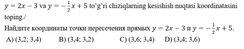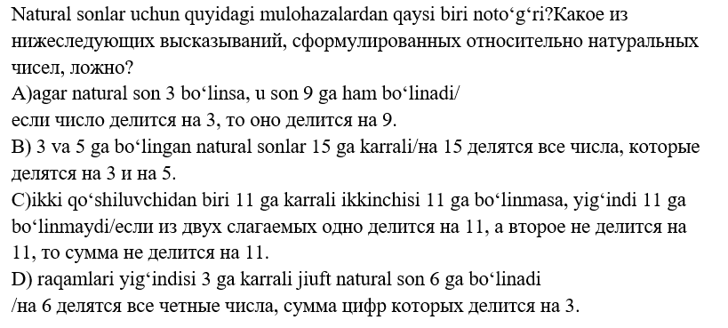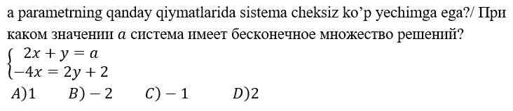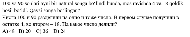1234567891011121314151617181920 9-sinf matematika fanidan online olimpiada savollari 9-sinf o'quvchilari uchun matematika fanidan online olimpiada savollari Manba: oo.uzedu.uz Test savollari soni: 20 ta BELLASHUV.UZ mahsuloti Barcha ma'lumotlarni to'g'ri kiriting. . A B C D . A B C D . A B C D . A B C D . A B C D . A B C D . A B C D . A B C D . A B C D . A B C D . A B C D . A B C D . A B C D . A B C D . A B C D . A B C D . A B C D . A B C D . A B C D . A B C D Facebook Twitter VKontakte 0% Перезапустить тест