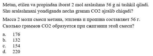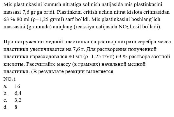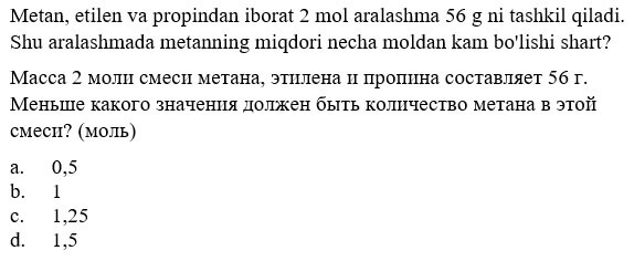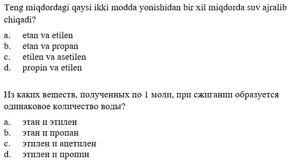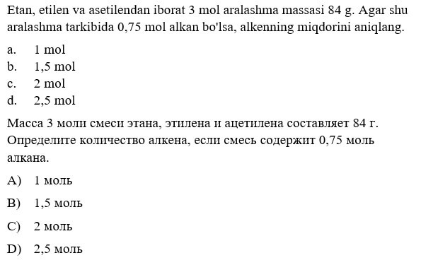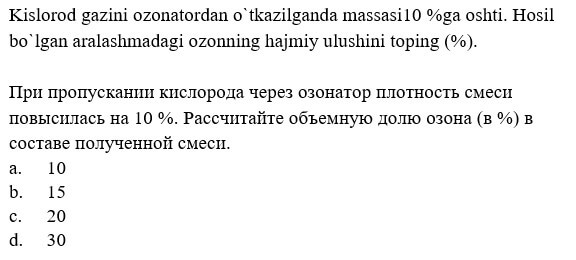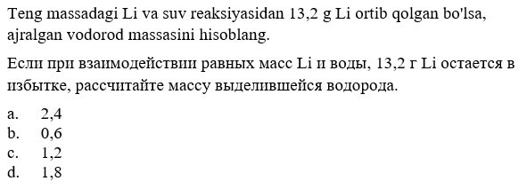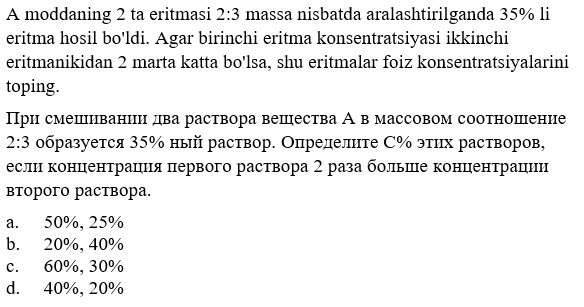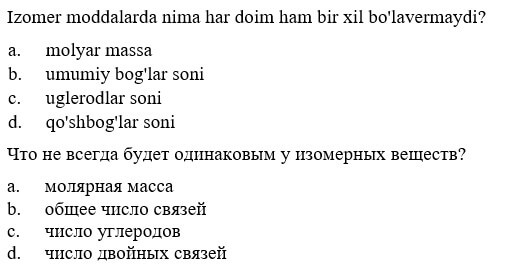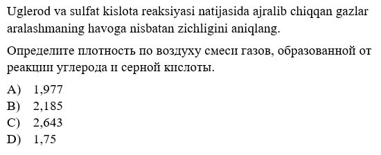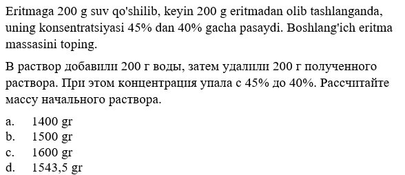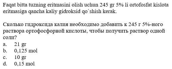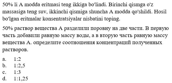 1234567891011121314151617181920 9-sinf kimyo fanidan online olimpiada 9-sinf o'quvchilari uchun kimyo fanidan online olimpiada savollari Manba: oo.uzedu.uz Test savollar soni: 20 ta Bajarish uchun ajratilgan vaqt: 60 daqiqa Bellashuv.uz Barcha ma'lumotlarni to'g'ri kiriting. . A B C D . A B C D . A B C D . A B C D . A B C D . A B C D . A B C D . A B C D . A B C D . A B C D . A B C D . A B C D . A B C D . A B C D . A B C D . A B C D . A B C D . A B C D . A B C D . A B C D Facebook Twitter VKontakte 0% Перезапустить тест