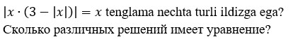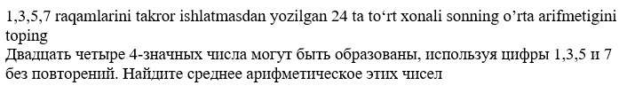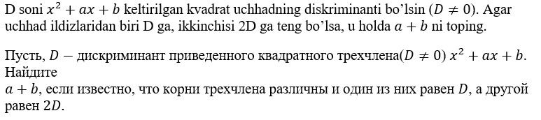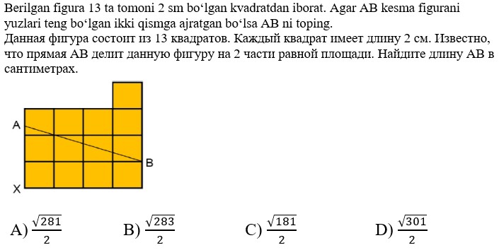1234567891011121314151617181920 10-SINF MATEMATIKA FANIDAN ONLINE OLIMPIADA SAVOLLARI 10-sinf o'quvchilari uchun matematika fanidan online olimpiada savollari Manba: oo.uzedu.uz Test savollar soni: 20 ta Bajarish uchun ajratilgan vaqt: 60 daqiqa Bellashuv.uz Barcha ma'lumotlarni to'g'ri kiriting. . A B C D . A B C D . A B C D . A B C D . A B C D . A B C D . A B C D . A B C D . A B C D . A B C D . A B C D . A B C D . A B C D . A B C D . A B C D . A B C D . A B C D . A B C D . A B C D . A B C D Facebook Twitter VKontakte 0% Перезапустить тест