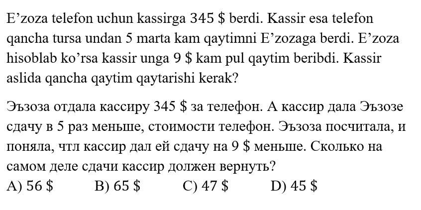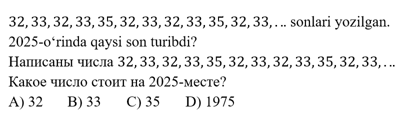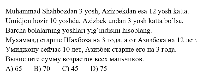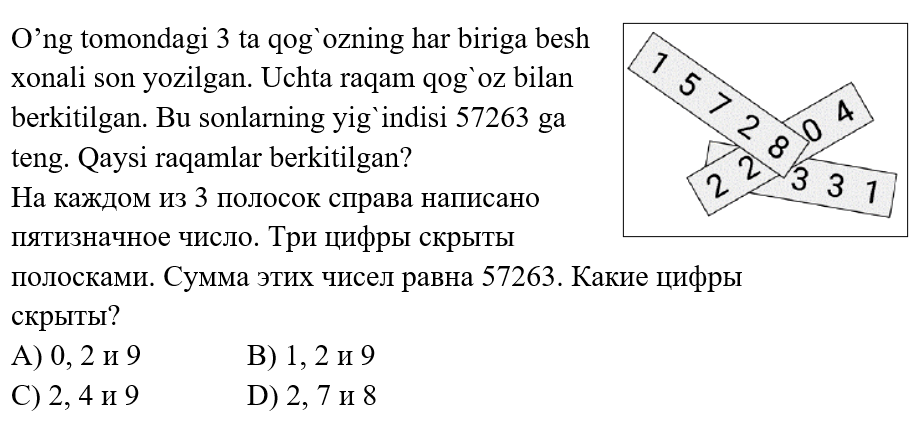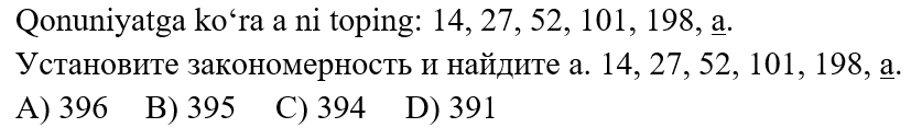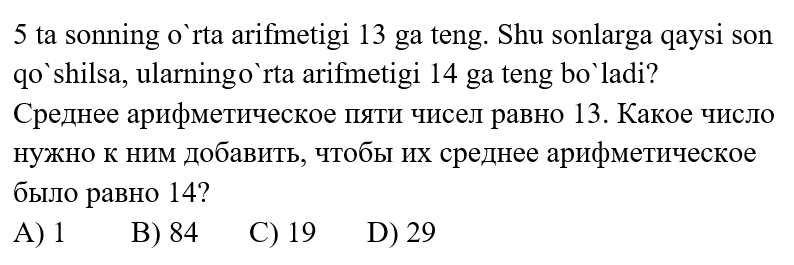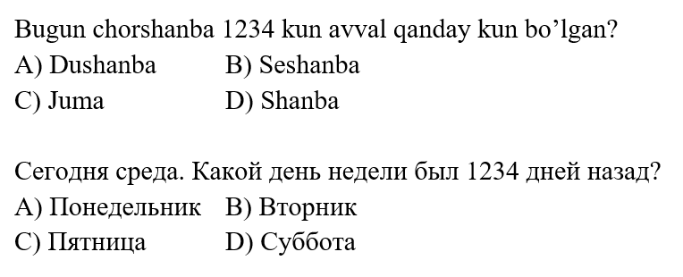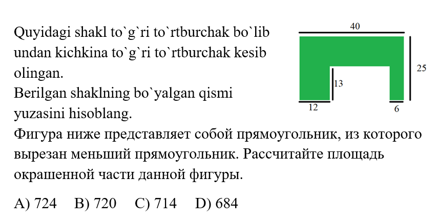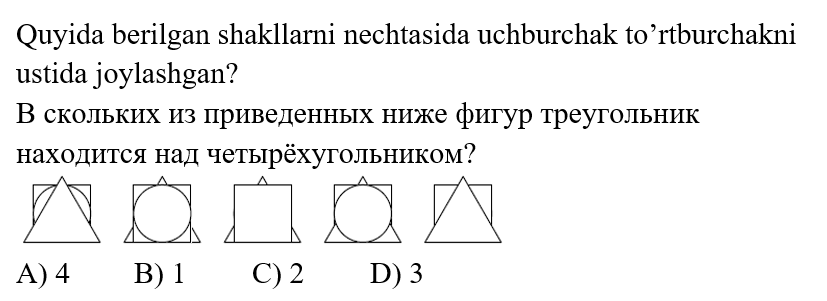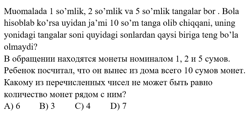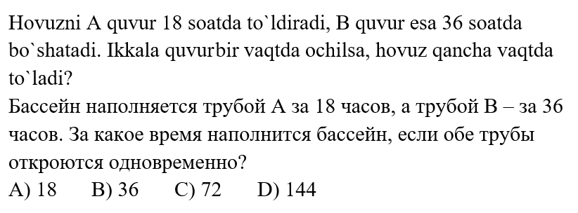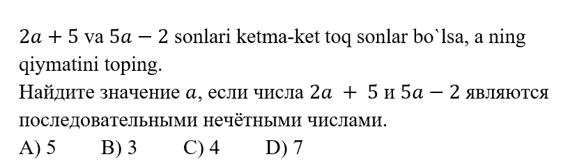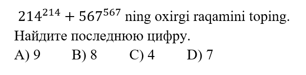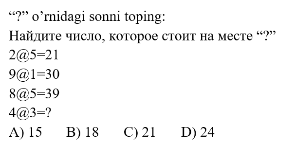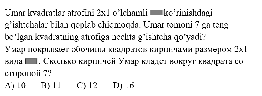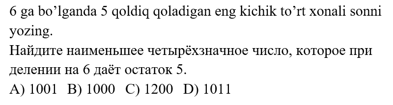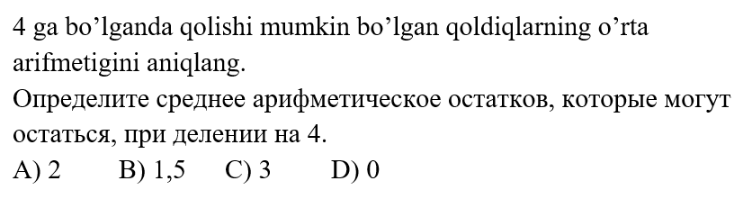 1234567891011121314151617181920 7-SINF O‘QUVCHILARI UCHUN MATEMATIKA FANIDAN ONLAYN OLIMPIADA Test savollar soni: 20 ta Bajarish uchun ajratilgan vaqt: 60 daqiqa TEST SAVOLLARI O'ZBEK HAMDA RUS TILLARIDA Barcha ma'lumotlarni to'g'ri kiriting. . A B C D . A B C D . A B C D . A B C D . A B C D . A B C D . A B C D . A B C D . A B C D . A B C D . A B C D . A B C D . A B C D . A B C D . A B C D . A B C D . A B C D . A B C D . A B C D . A B C D Facebook Twitter VKontakte 0% Перезапустить тест